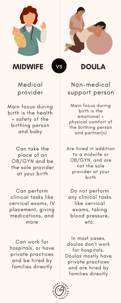 Absolutely! As you can see, while midwives and doulas both fall under the umbrella of “birth professionals,” they provide very different and complementary services to a birthing person and family.